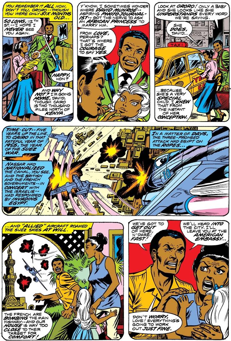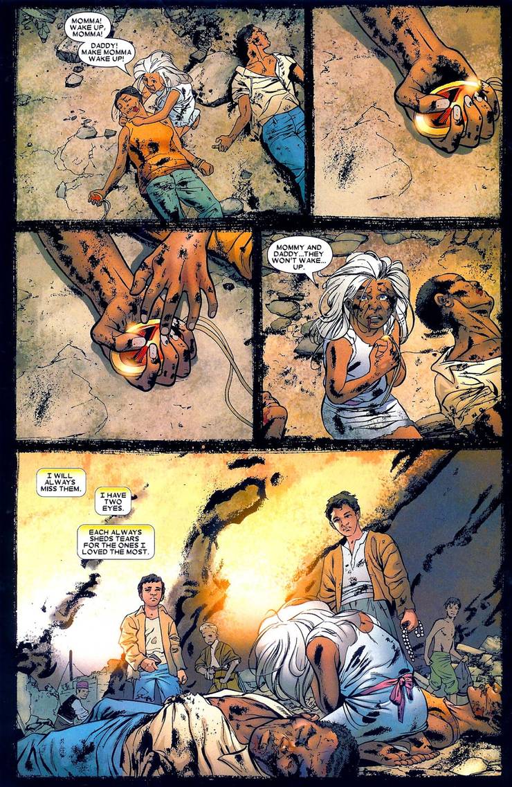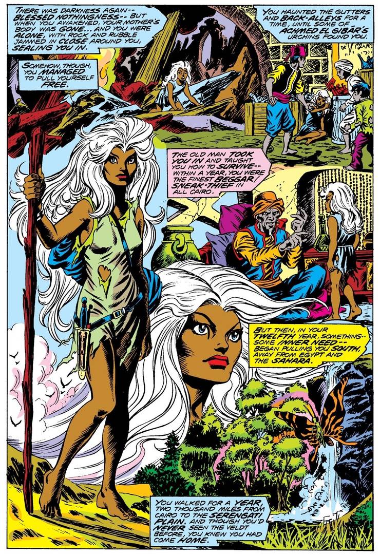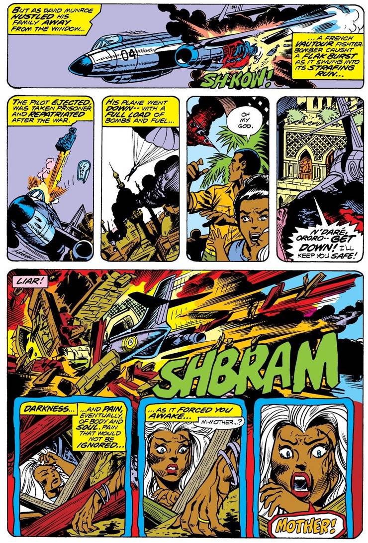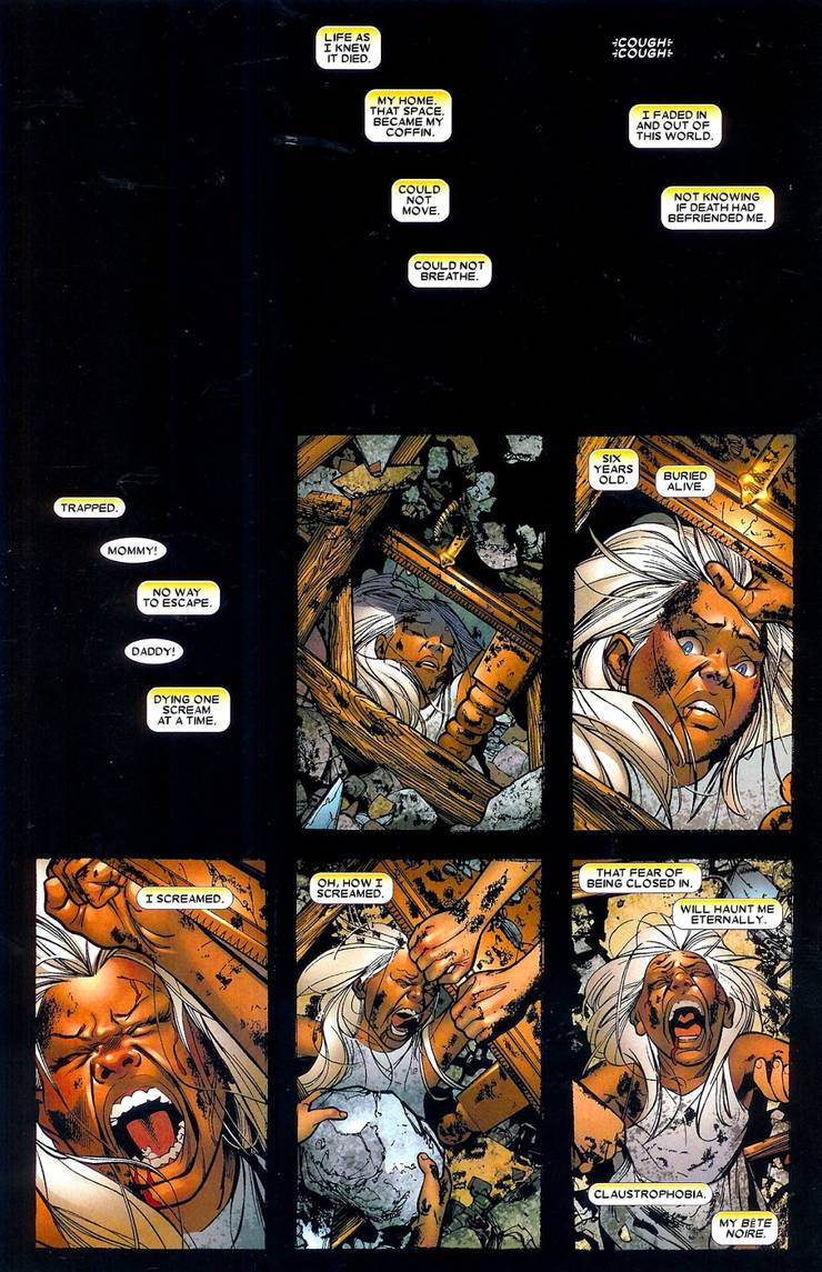 E com isso descobrimos a origem de Tempestade. Que ela morou no Egito com seus pais durante a Crise do Canal de Suez e um avião a jato colidiu com sua casa, matando seus pais e a prendendo sob os escombros, o que a tornou claustrofobia para a vida toda.