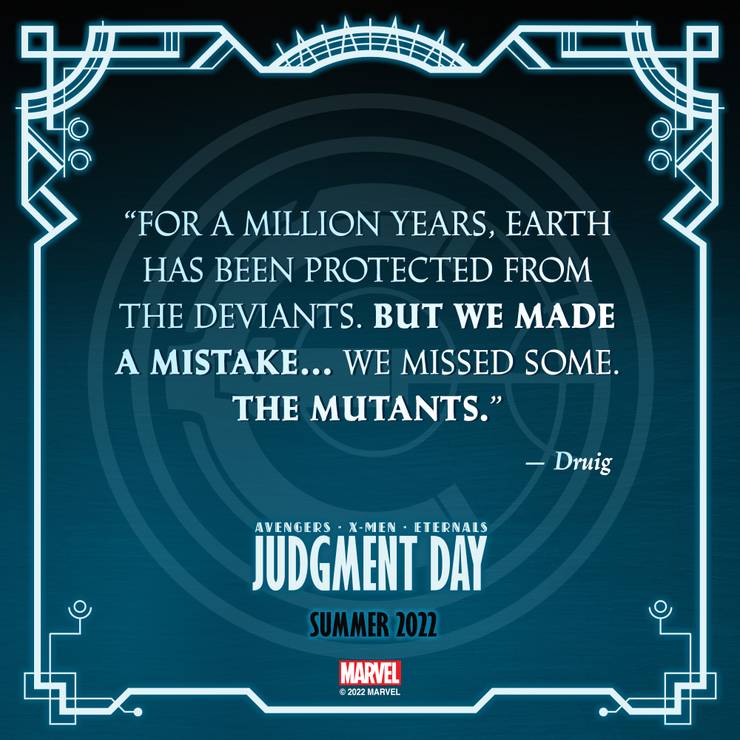 Os Vingadores, que entraram em conflito com os X-Men anos atrás, fizeram uma nova sede com cadáver de um Celestial Progenitor. O resultado é que tudo isso culminará no próximo evento da Marvel, Dia do Julgamento. Montando o cenário para esse embate épico, a Marvel lançou teasers com falas dos membros das três equipes envolvidas no evento. Confira: