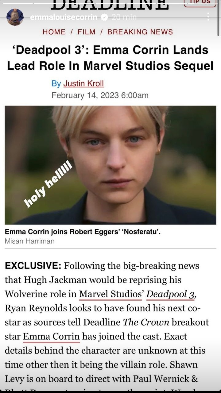 Após a confirmação surpreendente de Hugh Jackman como Wolverine, Emma Corrin integra a nova adição para o elenco de Deadpool 3, segundo o Deadline. Ganhando holofotes por sua interpretação como Lady Di na série The Crown, elu será antagonista no 3º filme do Mercenário Tagarela. Alguns rumores e fãs apontam que Corrin pode interpretar a vilã Perigo no filme. A novidade foi confirmada pelo próprio Deadpool dos cinemas, o ator Ryan Reynolds: